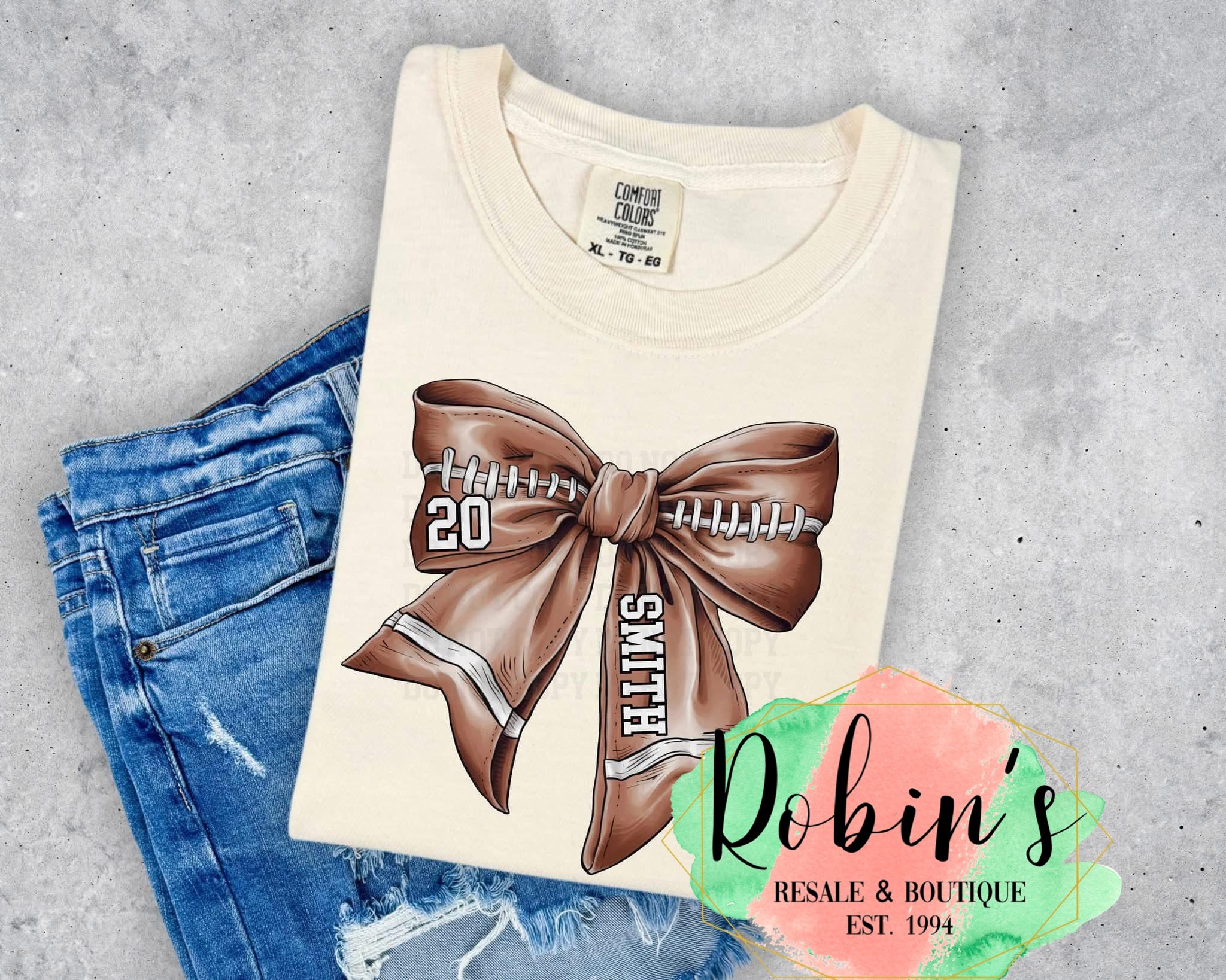 Totally customizable! Choose shirt color and size! Bow can say player name, last name, team name etc…anything you want! Choose no player number or you can choose to put their number as shown!