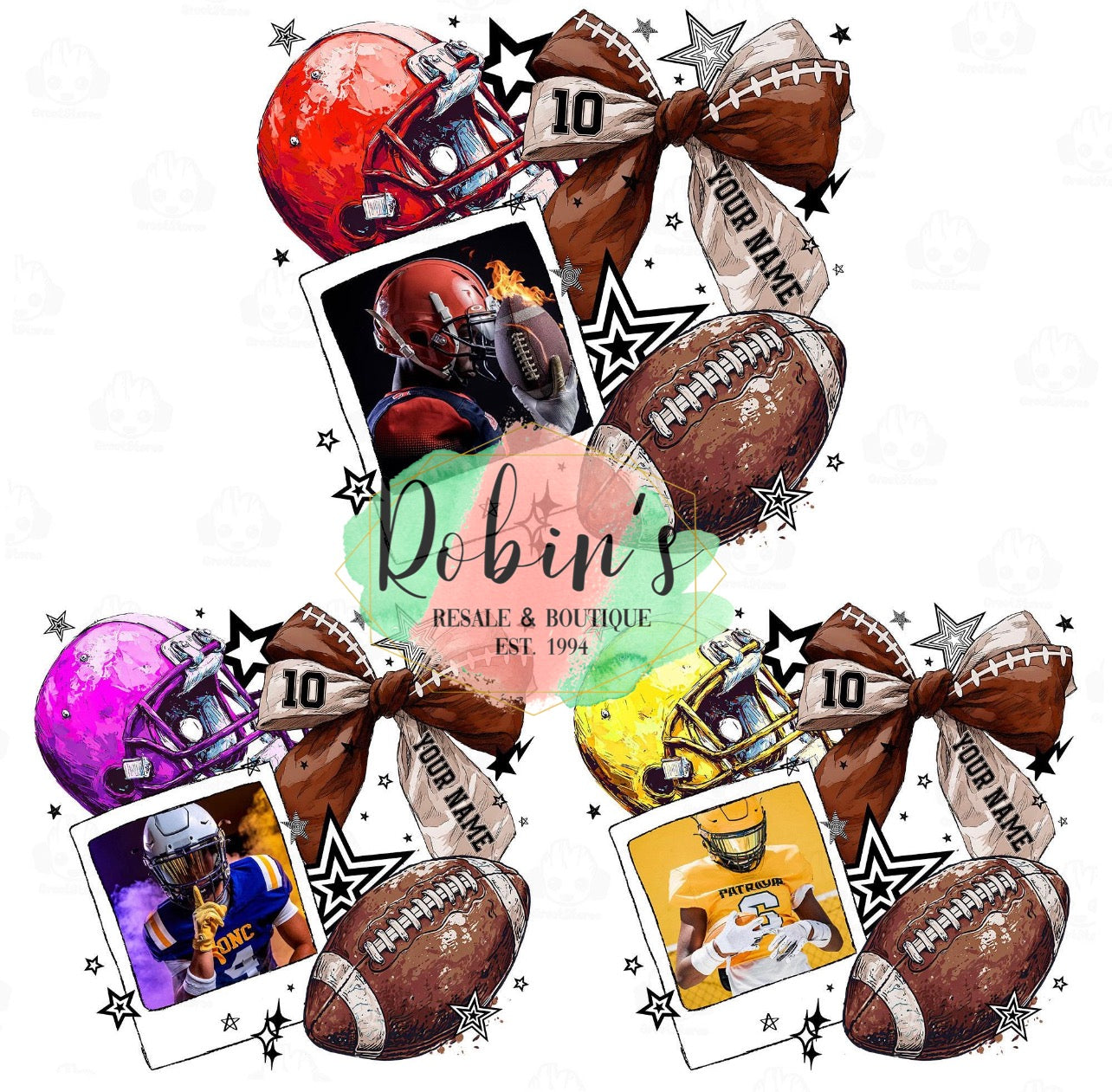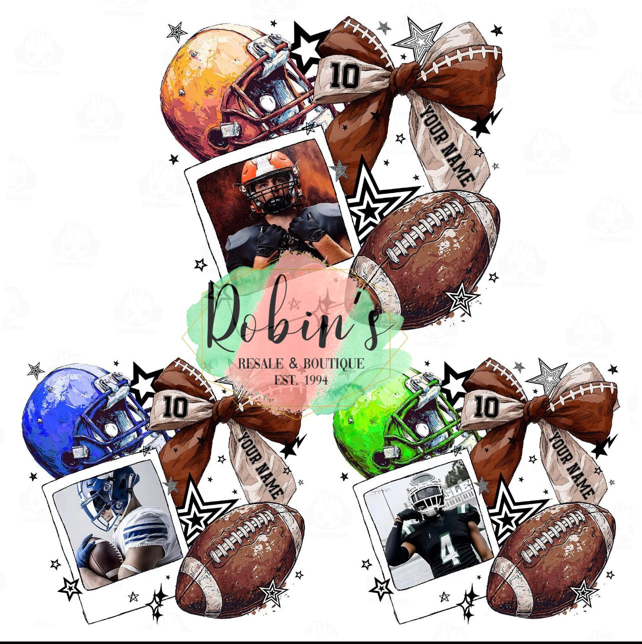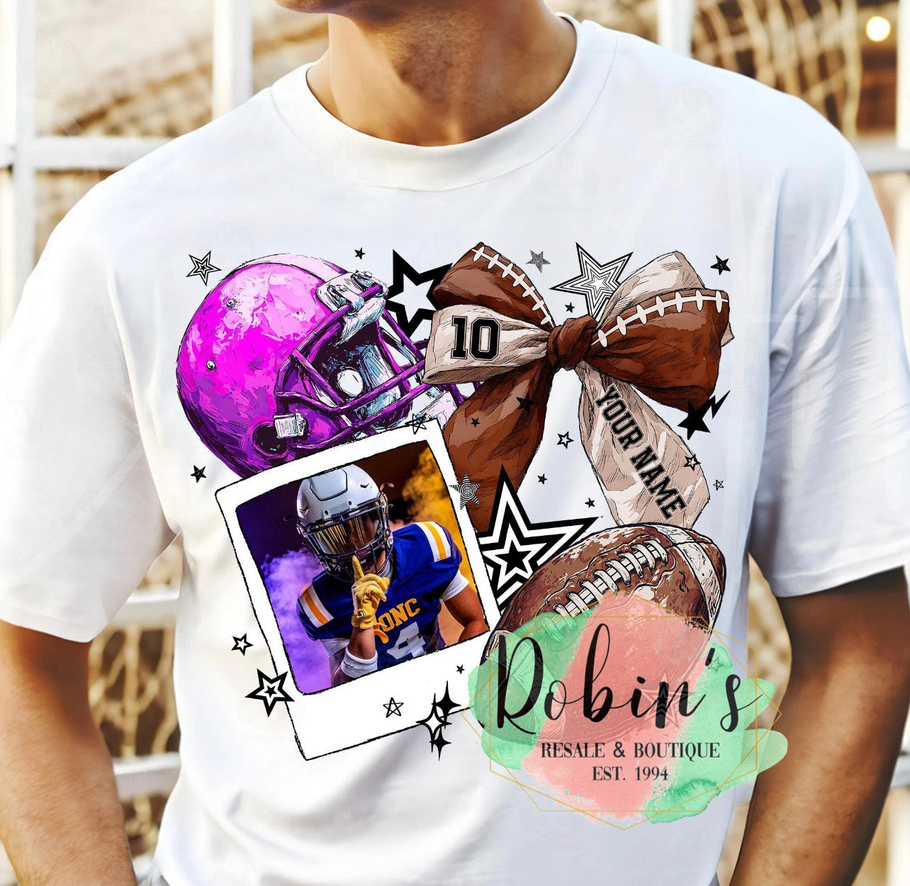 Customize and choose helmet color, name/number for child & photo! Name can be first/last name, team name etc! Choose Gildan softstyle tee, Comfort Colors Tee or Jerzees Sweatshirt! Please allow 14 business days to come in ! Select local pickup if you don’t want shipping charges! ⭐️ Please send photo you want used to the store Facebook page with order number! ⭐️